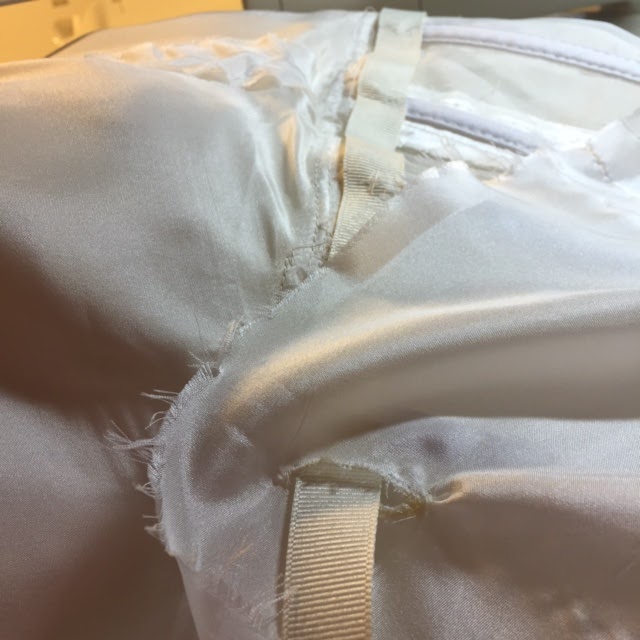 Next up on my list of hand sewing is something called a waist stay. It's a grosgrain ribbon (that will not stretch) that you stitch to the boning of the bodice at waist level. It acts like an internal belt for a strapless dress so that no indecent moments happen at your big event. No one wants to see that. No one. Okay, maybe Craig.
